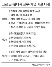 고교 교육과정에서 소홀하게 취급됐던 근·현대사 교육이 강화된다. 교육부는 22일 고교 1학년 국사 교사들이 활용할 수 있도록 ‘근·현대사 교수학습 자료'를 만들어 전국 고교에 배포했다. 그동안 고1 국사과목은 조선왕조 이전인 '전(前)근대사 중심'으로 구성돼, 자연·실업계 학생은 물론 인문계 학생조차 2 3학년 때 '한국 근·현대사'를 택하지 않으면 배울 기회가 사실상 없었다. 이번에 배포된 교수·학습 자료는 개화기 근대 개혁에 대한 논쟁을 비롯해 일제 식민통치의 특징, 한국 근·현대사 사료의 이해와 활용 등 한국 근·현대사를 쟁점별로 정리한 내용을 담고 있다. 특히 각종 도표, 사진 및 읽기자료 등을 풍부하게 게재해 교사들이 수업안과 수업자료로 활용할 수 있도록 했다. 또 일본의 교과서 왜곡 배경과 현상이 부록으로 포함됐다. 일본의 식민사관에 따라 한국사가 어떻게 왜곡됐는지 설명하고 있으며, 1953년 한일회담 일본 측 수석대표 구보타의 망언(많은 이익을 한국인에게 줬다 등)부터 최근의 망언까지 일본 지도층 인사들의 역사 왜곡 발언 내용도 적혀 있다. 이 밖에 중국의 동북공정(東北工程 중국 동북 변경 고대사에 대한 역사 연구 사업)과 고구려사 왜곡과 관련한 문제점도 포함돼 있다. 한편 교육부는 일본, 중국의 역사 왜곡에 대응하기 위해 현재 중학교 '사회' 교과에 포함돼 있는 '국사'와 '세계사'를 분리해 '역사'과목으로 독립시키고, 고교 근·현대사 교육을 강화하는 등의 '역사 교육 강화 방안'을 추진 중이다. 교육부는 이를 위해 내년부터 교육과정을 부분 개정하고 교과서를 수정 보완할 예정이다.
