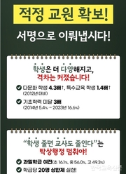 정부의 무분별한 교원 감축 정책에 맞서 적정 교원 확보를 요구하는 전 국민 대상 서명운동이 본격적으로 진행된다. 한국교총은 교사노동조합연맹, 전교조 등 교원단체와 전국교육대학생연합, 전국교원양성대학교총장협의회 등 주요 교육 단체들과 연대해, 서명운동에 돌입한다고 27일 밝혔다. 교총 등 교육계의 이번 서명운동은 정부의 교원 감축 정책이 미래 세대를 위한 투자를 포기하는 것이라는 사실을 알리고, 즉각 중단할 것을 호소하기 위해서다. 최근 정부를 중심으로 진행되고 있는 교원 감축의 주된 근거는 학력인구 감소다. 하지만 이는 탁상행정일 뿐이라는 것이 교육계의 주된 목소리다. 실제 학생 수가 줄었지만, 다문화 학생은 지난 10여 년간 4.3배, 특수교육 학생은 1.4배 증가했다. 또 기초학력 미달 학생도 약 3배가 늘었다. 이렇게 교육적 지원이 절실한 학생이 늘면서 교사가 감당해야 할 교육적 책무와 업무 강도가 더욱 커지고 있는 현실이다. 여기에 과밀학급 문제와 교원 비정규직화도 문제다. 2023년 기준으로 초등 학급의 16.1%, 중학교 학급의 56.0%, 고등학교 학급의 49.3%가 학생 수 26명 이상의 과밀학급이다. 또 기간제 교사의 비중도 전체의 15.4%(2024년도 기준)에 달하며, 중학교는 21.9%, 고등학교는 23.1%로 중등 교사 5명 중 1명 이상이 비정규직이다. 사립교는 더 심각해 3명 중 1명이 기간제 교사다. 이에 대해 교총은 “모든 학생의 학습권을 보장하고, 교육의 질을 개선하기 위해 학급당 학생 수 20명 상한제 법제화, 교원 정원 산정 기준 학급 수로 전환 등이 필요하다”고 촉구했다. 또 “교단의 비정규직화는 교단 사회의 안정을 저해하고, 교원의 전문성 신장을 가로막을 뿐만 아니라 잦은 교사 교체로 생활지도의 연속성을 단절시키고 있다”며 “안정적인 교육 환경 조성을 위해 정규 교원 확충은 더 이상 미룰 수 없는 과제”라고 설명했다. 교원 감축은 고교학점제 도입, AI 디지털 교육 강화와 같은 국정과제에 역행하는 정책이라는 지적도 이어지고 있다. 현장 교사들은 고교학점제 시행 이후 교사 부족으로 인한 현장의 피로도가 매우 높고, 수업의 질 저하로 직결되고 있다고 하소연하는 실정이다. 교총은 “필요한 인력과 자원은 공급하지 않은 채 장밋빛 청사진만 제시하는 것은 교육 현장을 기만하는 행위”라고 비판했다. 이 문제를 해결하기 위해 교원 수급 문제는 교육 전문가들에게 맡겨야 한다는 주장이 제기됐다. 교총은 “교육의 백년대계를 위해서는 교원 정원 정책의 권한을 기획재정부·행정안전부가 아닌 교육부와 시·도교육청으로 이관해 교육 현장의 목소리가 충분히 반영될 수 있는 합리적 의사결정 구조를 시급히 마련해야 한다”고 요구했다. 강주호 교총 회장은 “적정 교원 확보는 모든 학생이 차별 없이 양질의 교육을 받을 헌법적 권리를 보장하고, 우리 아이들이 살아갈 미래 사회의 건강한 초석을 다지는 일”이라며 “정부는 지금이라도 근시안적인 교원 감축 정책을 즉각 중단하고, 교육계의 절박한 요구에 귀를 기울여야 한다”고 주문했다. 또 “교육의 미래를 걱정하는 모든 국민께서 이번 서명운동에 적극 동참하시어 우리 아이들을 위한 변화를 함께 만들어 주길 바란다”고 호소했다. ‘적정 교원 확보 국민 서명운동’은 11월 17일까지 한국교총 홈페이지(www.kfta.or.kr)를 통해 참여할 수 있다.