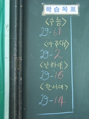 수능 시험이 두 달 앞으로 다가온 고3 학생들은 차분한 마음으로 시험 준비에 최선을 다하고 있습니다. 특히 2학기 수시모집에 응시한 학생들은 수능시험을 치르기 전에 대학별 전형 일정에 따라 별도로 시험을 치러야 하기에 부담이 늘어났습니다. 2학기 수시모집에 따른 원서접수가 대강 마무리 된 상황에서 이젠 대학별 수시전형에 최선을 다해야 할 시점입니다. 마침 1학기 수시모집에서 가장 좋은 성적을 낸 학급의 수업이 있었습니다. 수업 시작과 함께 학습목표를 제시하기 위해 칠판에 다가서자 수능 시험과 수시모집에 응시할 대학의 시험 날짜가 앞으로 얼마 남았는지 적혀 있었습니다. 시험까지 남아 있는 D-day를 적어 놓고 항상 준비하겠다 자세가 무척 진지해 보였습니다.