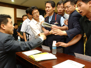28일 한나라당 이주호 의원이 국회도서관 소회의실에서 '국립대학 발전을 위한 법제화 방안' 공청회를 열려 하자 전국공무원노조 조합원들이 단상에 몰려 올라가 거칠게 항의 하고 있다. 이날 이 의원은 국립대의 자율성과 책무성 강화를 위해 국립대를 법인화하고 예산회계제도를 국가회계로 부터 분리시키는 법제화 방안을 발표할 예정이었다. 결국 국회 경위들에 의해 전공노 조합원들이 모두 끌려 나갈 때까지 공청회 개최는 30분 넘게 지연됐다.