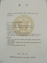 보도에 의하면 현재 만 20세 이상인 선거 연령이 19세로 낮춰진다고 한다. 따라서 십대의 선거 향방이 당락에 미치는 영향이 자못 크리라 본다. 그리고 올 3학년이 졸업하는 시기인 내년 지방선거부터 이것을 적용한다고 하니 벌써부터 십대들은 투표를 행사할 수 있다는 생각에 많이 고무되어 있다. 십대들이 투표에 참가하는 것이 중요한 것이 아니라 바르게 투표를 할 수 있도록 가르쳐야 한다고 본다. 따라서 17대 총학생회 회장 선거를 앞두고 본교에서는 학생들에게 올바른 선거문화에 대한 특강을 계획하고 있다. 본교의 17대 총학생회 회장 선거에 따른 후보자 등록이 공고되었다. 입후보자 자격 조건으로 본교 2학년에 재학 중인 학생이어야 하며 담임교사 및 학생 10인 이상의 추천을 받아야 하고 징계 사실이 없어야 하며 출석률 97%이상인 학생이어야 한다. 투표 방식은 회장은 직접 선거에 의하여 선출되며 부회장 2명은 회장과 함께 동반선출제로 선출한다. 입후보 희망자는 학생부에 비치한 소정 양식의 추천서를 첨부하여 학생부에 등록하면 된다. 지난 6월 25일(토) 후보자 등록 마감 결과, 회장 후보로 2명의 학생이 후보등록을 마쳤다.(기호1번 회장: 홍원기, 부회장 김현정, 안선욱, 기호2번 회장: 송제익, 부회장 이유진, 김효진) 이들 두 후보는 7월 11일(월) 후보자 공고 일을 마치고 7월 15일(금) 학생들의 직접 선거에 의해 당선이 확정된다. 본교에서는 사회 시간을 할애하여 올바른 선거 문화에 대한 전반적인 내용을 학생들에게 교육시키고는 있으나 학생들의 선거 운동이 자칫 가열되어 기성세대의 좋지 않은 모습을 그대로 흉내 낼까 하는 우려의 목소리도 나오고 있다. 따라서 본교에서는 사전 선거 운동시 선거법을 위반하여 당선된 후보자는 당선을 무효화시키기로 하였다. 당선이 확정된 차기 회장은 선거전에 학생들에게 내건 선거공약을 지킬 수 있도록 노력해야 할 것이며 학교 발전을 위해 학교가 무엇을 해주기를 바라기 보다는 자신이 먼저 학생과 학교를 위해 무엇을 할 것인가를 생각해 보아야 할 것이다.