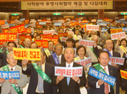 여당의 사학법 직권상정 압력이 계속된 27일 전체 사학이 ‘자정’을 다짐하는 ‘투명사회협약’을 체결하며 사학법 강행처리 시도에 간접적인 제동을 걸었다. 63빌딩 국제회의장에서 한국사학법인연합회 등 8개 사학 단체가 연 ‘사학분야 투명사회 협약 체결 및 다짐대회’에서 8천여 명의 사학 이사장, 사립학교 총ㆍ학장 및 교장, 교수ㆍ교사, 학부모대표 전원은 협약서에 일일이 사인하며 투명 사학 운영과 부패 척결을 약속했다. 이날 사학측은 “스스로 깨끗해지겠다”며 △법인 예결산 등 전면공개 △교원 공개채용 △외부기관 추천으로 감사 1인 선임 △대학평의원회 구성 △사학윤리위원회 기능 강화 및 상설 ‘사학운영 지도․감사 전담반’ 조직 등 제도 개편에 나서기로 했다. 사학측은 이 같은 내용을 이행하기 위해 7월 안으로 각 법인별로 정관개정 등 제반 법적 절차를 마치고 실행에 들어가기로 했다. 조용기 사학법인연합회 회장은 “국회와 국민들의 우려에 반성하며 그 뜻을 사학 스스로가 구체적인 자정 계획과 다짐에 담아 실천하기로 한 만큼 애정으로 지켜봐 달라”면서 “그런 후에도 사학이 계속 기대에 부응하지 못한다면 그 때는 국민과 정치권의 심판에 순응할 수밖에 없다”고 밝혔다. 그러나 조 회장은 “사학이 이렇게까지 ‘벗고’ 나온 상황에서도 일부 정치권과 집단이 개악적인 사학법을 강행처리한다면 지난해 10월 결의한 대로 학교 간판을 내리는 불행한 사태를 초래할 것”이라고 밝혔다. 한국교총 윤종건 회장도 격려사를 통해 “일부 사학의 비리를 빌미로 전체 사학의 자율성을 해치려는 사학법 개악 움직임에 교총도 저지투쟁에 앞장설 것”이라며 “이번 다짐대회를 통해 투명한 사학, 존경받는 사학으로 거듭나길 기대한다”고 말했다.