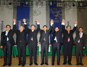 경기교총과 인천-경기기자협회 공동으로 11일 경기대 수원캠퍼스 텔레컨벤션센터에서 경기도교육감선거 입후보자 초청 교육정책토론회를 열었다. 참석자들이 토론회가 끝난후 손을 맞잡고 선전을 다짐하고 있다.