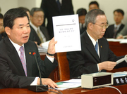여야 의원 20명으로 구성된 '독도수호 및 일본 역사교과서 왜곡대책 특위'는 21일 국회 의원회관에서 일본의 독도영유권 주장과 역사교과서 왜곡에 대한 첫 회의를 열었다. 김진표 교육부총리는 반기문 외교통상장관과 함께 참석한 가운데 일본 역사교과서 왜곡에 관한 의원들의 추궁에 답변을 하고 있다.