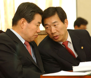 국회 교육위원회(위원장 황우여)는 21일 전체회의를 열고 상정된 19개 법안에 대한 심사를 벌였다. 김진표 교육부총리(왼쪽)가 의원들의 질의에 답변하기에 앞서 김영식 차관과 머리를 맞대고 숙의 하고 있다.