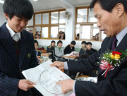 서울 신연중 정인관 교장이 졸업생 297명 전원에게 졸업축하 휘호를 선물하며 힘찬 출발을 축하하고 있다.