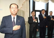 이기준 교육부총리가 5일 취임식에서 국민의례를 하고 있다. 취임초부터 도덕성 논란에 휩싸인 이 부총리는 결국 7일 오후 전격적으로 사의를 표명했다.