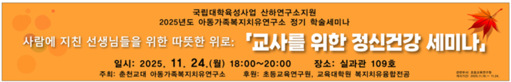 춘천교대 ‘아동가족복지치유 연구소’(소장 윤지현 교수)는 24일 18시 실과관 109호에서 2025년도 정기 학술세미나를 개최한다. 이번 학술 행사는 ‘교권’ 관련 시리즈 세미나로 교원들의 소진 방지 및 정서적 안녕 방안을 함께 생각해 보는 자리다. ‘교사를 위한 정신건강’을 주제로 강원대병원 정신의학과 박종익 교수의 강연과 더불어 다양한 논의가 이뤄질 예정이다. 아동가족복지치유 연구소는 교육 분야에서 관심을 받아오지 못한 소외된 이웃의 문제와 삶의 어려움을 겪고 있는 아동·청소년·가족·교육의 문제를 통합적으로 연구하며 다양한 연계 사업을 추진하고 있다. 참여 신청 문의는 아동가족복지치유연구소(033-260-6474)로 가능하다.