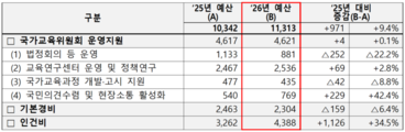 국가교육위원회(국교위)의 2026학년도 예산이 2025년대비 10억 원 정도 늘어난다. 국교위는 3일 2026학년도 예산으로 113.1억 원이 확정됐다고 밝혔다. 이는 2025년 103.4억 원에서 9.7억 원(9.4%) 늘어난 액수다. 앞서 지난달 국교위는 정부의 지출 구조조정에 따라 2025년 예산보다 1.8% 감축한 101.5억 원을 국회에 제출했다. 그러나 ‘교육과정 연구센터 운영’, ‘교육과정 모니터링단’, ‘국민참여위원회’, ‘국민의견수렴’, ‘조직 확대 관련 인건비’ 등이 증액되면서 오히려 전년 대비 10% 가까이 오른 예산으로 확정됐다. 특히 인건비가 32억6200만 원에서 43억8800만원으로 가장 많이 올랐다. 11억2600만 원이라는 증액 규모는 물론 34.5%라는 증가율 모두 가장 높게 나타났다. 이에 대해 국교위는 “사회적 합의 기능 강화를 위한 조직 확대 관련 증액”이라고 설명했다.