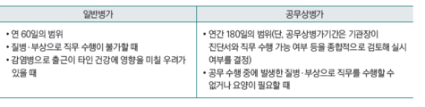 병가의 종류별 내용 일반병가의 운영 방법 •연간 누계 6일까지는 진단서 제출 없이 병가를 사용할 수 있습니다. •다만 7일 이상 연속하여 병가를 사용하거나, 연간 누계가 6일을 초과하는 경우에는 「의료법」 제17조에 따라 발급된 진단서를 제출해야 합니다. •동일한 사유로 병가를 사용하는 경우, 최초에 제출한 진단서로 갈음할 수 있습니다. •진단서를 제출하지 못할 때는 연가를 대신 사용해야 하며, 동일 사유에 해당하는지 여부는 학교장이 진단서 내용 등을 종합적으로 고려해 판단합니다. 공무상병가의 운영상 유의 사항 •공무상병가는 「공무원 재해보상법」에 따른 요양 승인 결정 범위 내에서, 기관장이 진단서와 직무 수행 가능 여부 등을 종합적으로 검토해 실시 여부를 결정합니다. •공무상요양승인기간 중이라도 공무상병가 일수 180일이 만료된 이후에는, 동일 사유로 다시 공무상병가를 승인할 수 없습니다. •공무상요양승인을 신청 후 심의 중인 경우에는 결정 통보를 받을 때까지 일반병가 또는 연가를 사용할 수 있습니다. 이후 해당 질병·부상이 공무상 발생으로 인정되면, 사용한 일반병가·연가를 공무상병가로 소급 처리할 수 있습니다. 선생님들의 QA Q. 동일한 사유의 질병으로 연도를 달리하여 병가를 연속 사용하는 경우, 진단서를 다시 제출해야 하나요? A. 일반병가는 매년(1월 1일부터 12월 31일까지) 60일 한도 내에서 사용할 수 있습니다. 따라서 다음 해(1월 1일부터)에는 병가 60일을 다시 사용할 수 있습니다. 또한 연도가 바뀌어도 진단서에 기재된 치료기간이 계속되는 동일 사유라면, 이전 연도에 제출한 진단서로 갈음할 수 있습니다. Q. 치료기간이 명시되지 않은 진단서를 제출한 경우, 병가를 승인할 수 있나요? A. 가능합니다. 학교장은 진단서(전문가의 의학적 소견·진술 등)를 종합적으로 검토해 직무 수행 가능 여부를 판단 후 병가 승인 여부 및 기간을 결정합니다. 따라서 진단서의 치료기간은 병가 판단의 참고 기준일 뿐, 필수 요건은 아닙니다. 학교장은 진단서에 치료기간이 명시되지 않은 경우에도 병가를 승인할 수 있습니다. Q. 공무상 부상으로 병가를 6개월 사용하고 1년간 휴직한 교원이 복직하였으나, 동일 질병의 후유증으로 5~6개월의 요양이 더 필요한 경우 다시 공무상병가 6개월을 허가받을 수 있나요? A. 공무상병가는 최대 180일까지만 허가할 수 있으며, 연도가 바뀌어도 동일 질병에 대해서는 추가적인 허가가 불가합니다. 또한 「국가공무원복무규정」 제18조 제2항에 따라 인사혁신처에 공무상요양승인기간 내에서만 허가할 수 있습니다. Q. 병가일수(기간)는 어떻게 산정하나요? A. 질병 또는 부상으로 인한 지각·조퇴 및 외출은 구분 없이, 누계시간을 합산해 8시간을 1일로 계산합니다. 2개 연도에 걸쳐 병가를 사용하는 경우, 각 연도별로 30일을 초과하는 병가에 한하여 공휴일과 토요일을 휴가일수에 포함합니다. 서로 다른 사유의 병가일지라도, 연간 병가 일수 총합이 30일 이상이면 공휴일·토요일을 포함합니다. Q. 병가·병조퇴·병지각·병외출을 합산하여 병가를 50일 5시간을 사용하였을 때, 향후 실시할 수 있는 병가일수는 어떻게 되나요? A. 병가는 연간 60일 이내 사용 가능하므로, 잔여 일수는 9일 3시간입니다. 요양이 더 필요할 경우에는 잔여 연가를 사용하거나 질병휴직을 신청해야 합니다.