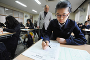 전국 고3 학생들의 학력수준 진단과 대학수학능력시험에 대한 적응력 향상을 위한 전국연합학력평가 시험이 13일 일제히 진행됐다. 서울 명동 계성여고 학생들이 1교시 언어영역 문제를 풀고 있다. 이번 학력평가는 수능시험과 동일한 형태로 언어영역을 비롯한 수리, 외국어, 사회탐구, 과학탐구 등 5개 영역에 걸쳐 치러졌다.