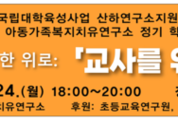 춘천교대 ‘아동가족복지치유 연구소’(소장 윤지현 교수)는 24일 18시 실과관 109호에서 2025년도 정기 학술세미나를 개최한다. 이번 학술 행사는 ‘교권’ 관련 시리즈 세미나로 교원들의 소진 방지 및 정서적 안녕 방안을 함께 생각해 보는 자리다. ‘교사를 위한 정신건강’을 주제로 강원대병원 정신의학과 박종익 교수의 강연과 더불어 다양한 논의가 이뤄질 예정이다. 아동가족복지치유 연구소는 교육 분야에서 관심을 받아오지 못한 소외된 이웃의 문제와 삶의 어려움을 겪고 있는 아동·청소년·가족·교육의 문제를 통합적으로 연구하며 다양한 연계 사업을 추진하고 있다. 참여 신청 문의는 아동가족복지치유연구소(033-260-6474)로 가능하다.