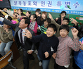 28일 서울명덕초에서 열린 '탈북동포와 인권' 특별수업에서 학생들이 탈북동포들의 인권과 평화통일을 기원하는 메시지를담은 종이비행기를 날리고 있다.