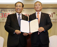 안양옥 한국교총 회장(우)과 황우여 한국청소년연맹 총재는 12일 한국교총에서 학교폭력을 예방하고 행복한 학교 환경을 만들기 위한 '365 Happy School' 선포식을 개최하고, 양 기관의업무협약을 체결했다. 한국청소년연맹 소속 학생들과 각 단체 관계자들이 피켓을 들고 기념촬영을 하고 있다.