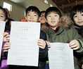 2일 오전 서울명덕초 강당에서 학생, 학부모, 교사 등 1500여명이 참석한 가운데 ‘학교폭력 없는 평화로운 학교 만들기’를 다짐하는 선언식이 열렸다. 명덕초 학생들이 이날 발표된 선언문을 들고 있다. 학교 폭력, 왕따 이제 그만! 서울명덕초 학생들이 진지한 표정으로 선서를 하고 있다. 학교 폭력 안녕~ 서울명덕초 학생들이 선언문을 낭독하고 손을 흔들고 있다.