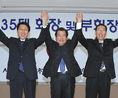 제35대 서울교총 회장 선거에서 당선된 이준순 회장(서울 수도여고 교장·가운데)과 이재완(대진여고 교사·왼쪽), 진만성(서울강신초 교장·오른쪽) 부회장이 당선증을 교부받은 후 환호하고 있다.