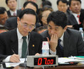 국회 교육과학기술위원회는 23일 교과부 '2009년도 주요업무 및 현안보고'에서 학업성취도 평가 조작 파문의 책임과 대책을 놓고 논란을 벌였다. 학업성취도와 관련한 질문에서 이주호 제1차관이 안병만 교과부 장관에게 답변을 논의하고 있다. 권영길 민주노동당 의원이'2009학년도 고려대 수시 2-2 전형' 과 관련해고교등급제 의혹에 대해 안병만 장관에게 추궁하고 있다.