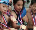 제13회 서울어린이 한강 헤엄쳐 건너기 행사가 18일 열렸다.초등학생과 유치원생 등 118개 학교 821명은 한강시민공원 잠실지구에서 뚝섬지구까지 헤엄쳐 건넜다. 서울어린이한강헤엄쳐건너기 행사는 94년 6월 24일 서울덕수초등학교 전교생 625명이 6.25를 상기하는 의미에서 주먹밥을 먹고 북한강 625M를 헤엄치는 통일기원행사로 시작됐다. 지금까지12회의 행사를 통해 1만1299명의 학생들이 한강을 헤엄쳐 건넜다.사진은 수영을 마친 학생들이 기념메달을 뽐내며 즐거워하는 모습.