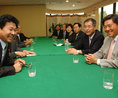 16일 오전 서울올림픽파크텔에서 열린 8.15 민족대축전 교육부문 상봉행사에서 윤종건 한국교총 회장과 이수일 전교조 위원장, 김성철 조선교육문화직업동맹 위원장 등이 평양 교육자대회에 대해 논의하고 있다.