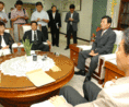 김진표 교육부총리, 윤종건 한국교총회장, 이수일 전교조위원장, 민경숙 한교조위원장이 20일 오전 장관실에서 교원평가제에 대한 공동합의문 발표 문안에 대해 논의했다.