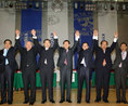 경기교총과 인천-경기기자협회 공동으로 11일 경기대 수원캠퍼스 텔레컨벤션센터에서 경기도교육감선거 입후보자 초청 교육정책토론회를 열었다. 참석자들이 토론회가 끝난후 손을 맞잡고 선전을 다짐하고 있다.