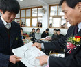 서울 신연중 정인관 교장이 졸업생 297명 전원에게 졸업축하 휘호를 선물하며 힘찬 출발을 축하하고 있다.