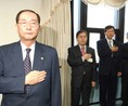 이기준 교육부총리가 5일 취임식에서 국민의례를 하고 있다. 취임초부터 도덕성 논란에 휩싸인 이 부총리는 결국 7일 오후 전격적으로 사의를 표명했다.